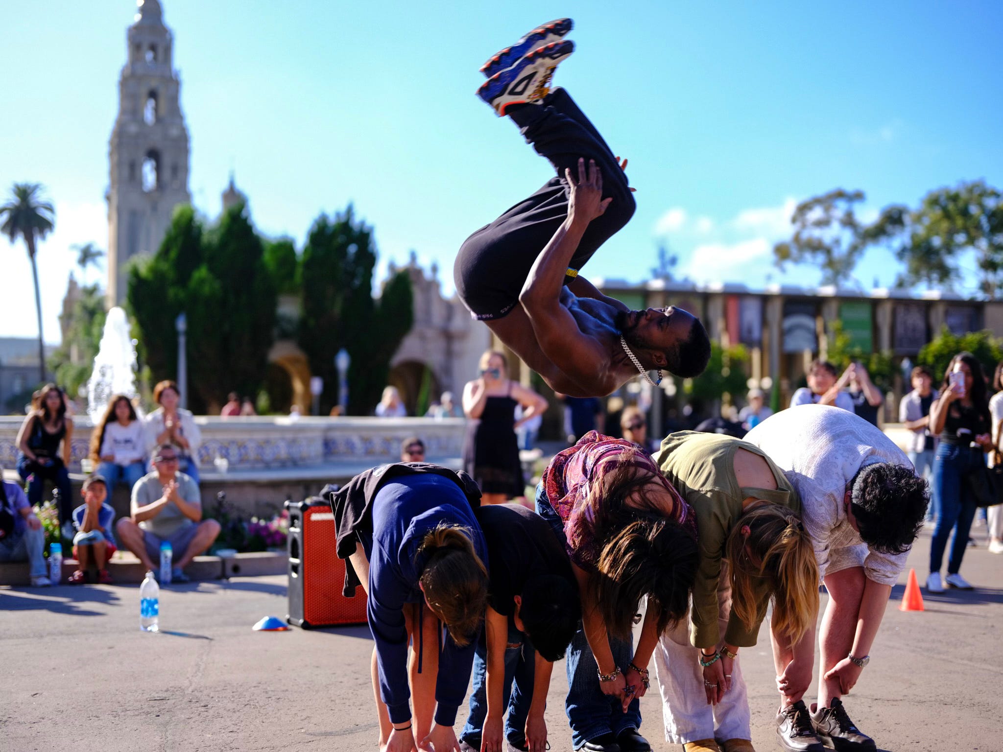 Incredible moves by street dancer Kareem Ali witnessed during a visit Balboa Park, San Diego. (That’s Chloe in the green shirt, she was pulled from the crowd.)